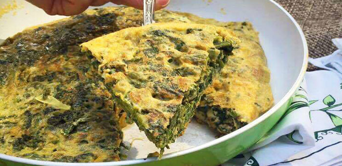 Προθερµαίνουµε τον φούρνο στους 180 βαθµούς. Χτυπάµε τα αυγά µε ένα πιρούνι µέχρι να σχηµατισθεί αφρός, ρίχνουµε το γάλα, το τυρί και συνεχίζουµε το χτύπηµα για λίγα λεπτά ακόµα. Τα ανακατεύουµε µε το µείγµα των χόρτων και τα αδειάζουµε σε ένα στρογγυλό σκεύος που έχουµε βουτυρώσει ελαφρά.