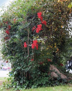 Ο ακανθώδης πυράκανθος Pyracantha coccinea μπορεί να έχει ανθοφορία μικρής διάρκειας αλλά το φθινόπωρο γεμίζει με τους πορτοκαλί καρπούς του που παραμένουν στο φυτό όλο το χειμώνα. Το αειθαλές κοινό βιβούρνο Viburnum tinus το φθινόπωρο εμφανίζει τους μικρούς μαύρους καρπούς του, τους οποίους και διατηρεί κατά τη διάρκεια του χειμώνα.