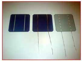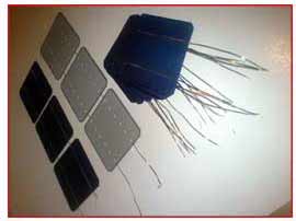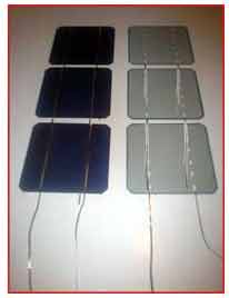 Πήρα 2 φ/β κυψέλες για δοκιμές και κόλλησα – ξεκόλλησα καλώδια περίπου 10 φορές, μέχρι που συνήθισε το χέρι. Τα μυστικά είναι: Το κολλητήρι να είναι 40 έως 60 watt με επίπεδη μύτη (μικρότερο δεν κάνει). Πρέπει να ζεσταθεί καλά πριν αρχίσουμε (περ. 15 λεπτά). Το κρατάμε αρκετά πλάγια ώστε να πατά όσο το δυνατό μεγαλύτερη επιφάνεια της μύτης πάνω στην καλωδιοταινία. Ξύνουμε πολύ ελαφρά τις γραμμές-οδηγούς πάνω στις ηλιακές κυψέλες με ένα ίσιο κατσαβιδάκι σε όλο το μήκος τους, για να φύγει λίγη από την λευκή επικάλυψη και να κολλήσει ευκολότερα η καλωδιοταινία. Πριν την κόλληση περνάμε λίγo υγρό flux για κολλήσεις (σαν την πάστα-λίπος-σολντερίνη σε υγρή μορφή όμως) πάνω στις γραμμές-οδηγούς του φ/β στοιχείου για ευκολότερη και ισχυρότερη εφαρμογή (πωλείται σε καταστήματα ηλεκτρονικού υλικού). Κρατάμε την καλωδιοταινία με το δείκτη και τον αντίχειρα πάνω στη γραμμή και ξεκινάμε την κόλληση από τη μέση μέχρι κάτω με σταθερό πέρασμα και ελαφρά μόνο πίεση για 2-3 δευτερόλεπτα. Μετά γυρνάμε την φ/β κυψέλη 180 μοίρες και κολλάμε με τον ίδιο τρόπο το υπόλοιπο κομμάτι. Στη φωτογραφία πάνω, φαίνεται ένα φωτοβολταϊκό στοιχείο χωρίς καλώδια,ένα με τα καλώδια κολλημένα στην μπροστινή όψη και ένα φ/β στοιχείο από την πίσω όψη (τα καλώδια που φαίνονται στο 3ο φ/β στοιχείο εξέχουν από την μπροστινή / μπλέ πλευρά: Στην πίσω όψη δεν κολλάμε ακόμη καλώδια. Αυτό θα γίνει αργότερα). Στην επόμενη φωτογραφία φαίνονται όλα μας τα στοιχεία έτοιμα για τη διασύνδεση μεταξύ τους. Το μήκος κάθε τμήματος καλωδιοταινίας είναι τέτοιο ώστε να φθάνει και για την πίσω πλευρά της επόμενης φ/β κυψέλης που θα κολληθεί, όπως φαίνεται και στις φωτογραφίες.