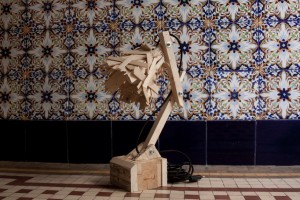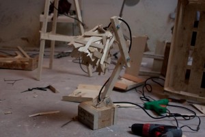 Ξεκινήστε κόβοντας τις σανίδες από τα τελαράκια σε μικρότερα κομμάτια πράγμα που είναι πολύ εύκολο γιατί το ξύλο είναι ιδιαίτερα λεπτό. Φτιάξτε την βάση του φωτιστικού από τα απομεινάρια ξύλου που πήρατε από τον ξυλουργό δημιουργώντας ένα τετράγωνο που του λείπει η μία πλευρά, ή από ένα ακανόνιστο κομμάτι ξύλου που σας αρέσει. Φτιάξτε με δύο μακρόστενα κομμάτια ξύλου ενώνοντας τα με βίδα ένα Λ που θα αποτελεί το βραχίονα του φωτιστικού και στερεώστε το στη βάση με βίδες χρησιμοποιώντας δύο μικρά τρίγωνα κομμάτια ξύλου για έξτρα στήριξη. Στερεώστε την γλάστρα πάνω στο βραχίονα και περάστε τον απαραίτητο ηλεκτρολογικό εξοπλισμό. Με σιλικόνη ή με συραπτικό αρχίστε να κολλάτε πάνω στη γλάστρα τα κομμάτια από τα τελάρα μέχρι να έχετε καλύψει όλη την επιφάνεια της και να έχετε το επιθυμητό για σας αποτέλεσμα.