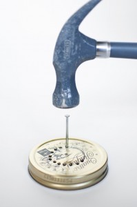 Βήμα 1ο. Αφαιρέστε το καπάκι από το βάζο και σχεδιάστε με ένα μολύβι ένα κύκλο με διάμετρο ίση με τη διάμετρο του ντουί που έχετε επιλέξει. Στη συνέχεια, τρυπήστε τον κύκλο περιμετρικά με το καρφί και το σφυρί. Αφαιρέστε το εσωτερικό του κύκλου προσέχοντας τις αιχμηρές γωνίες.