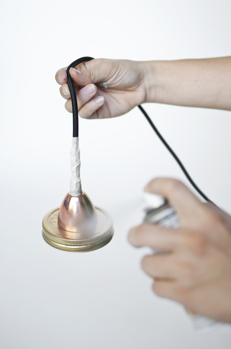 Βήμα 3ο. Με μια ταινία καλύψτε το καλώδιο από την βάση μέχρι περίπου τη μέση και βάψτε ομοιόμορφα με το σπρέι το καπάκι και το ντουί. Αφήστε τα στην άκρη να στεγνώσουν. Όταν είναι έτοιμα, συνδέστε το ντουί με τη λάμπα και βιδώστε το γυάλινο βαζάκι.