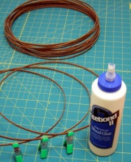 Αφού πάρεις τις ράβδους βάλε λίγη κόλλα περίπου ένα εκατοστό πριν από το τέλος της μίας πλευράς και κάνε καμπύλη για να φτάσει στην άλλη πλευρά, ώστε να έχεις έναν κύκλο. Ακούμπα τις δύο άκρες και βάλε έναν σφιγκτήρα για να τις κρατήσεις ενωμένες.