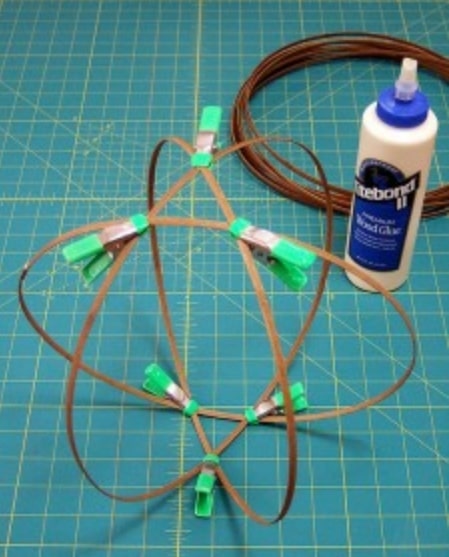 Μόλις δεις ότι έχει στεγνώσει η κόλλα, πάρε τρεις από τους κύκλους που έφτιαξες και ένωσε τους όπως βλέπεις και στην εικόνα για να φτιάξεις μια σφαίρα. Οι διασταυρώσεις θα πρέπει να δημιουργούν ένα ισόπλευρο τρίγωνο από το οποίο θα περάσει και το καλώδιο της λάμπας. Βάλε κόλλα και από πάνω τους σφιγκτήρες για ακόμη 2 ώρες.
