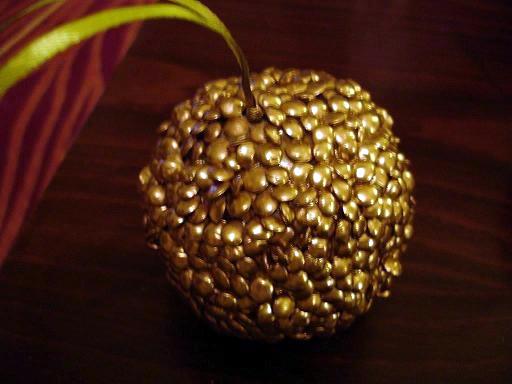 | Επικάλυψη χριστουγεννιάτικης μπάλας με φακές και χρυσή μπογιά. |