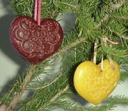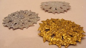 - Κόψτε χαρτόνι σε σχήμα αστεριού, δέντρου, καμπάνας κ.ά. Καλύψτε την επιφάνεια τους με κόλλα και βουτήξτε τα σε χρυσόσκονη ή σε χάντρες. Τρυπήστε τα στο πάνω μέρος και περάστε κλωστή, σχοινάκι ή κορδέλα για να τα κρεμάσετε. Εναλλακτικά μπορείτε να χρησιμοποιήσετε χρωματιστό γυαλιστερό χαρτόνι.