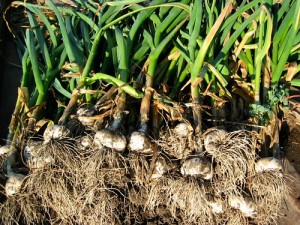Τα σκόρδα είναι έτοιμα για συγκομιδή όταν τα φύλλα τους γίνουν καφέ και ξεραθούν. Σταματήστε να τα ποτίζετε μερικές εβδομάδες πριν τη συγκομιδή. Αφού βγάλετε τα σκόρδα από το χώμα, μπορείτε να τα πλέξετε σε πλεξούδες. Κρεμάστε τις πλεξούδες σε ένα μέρος μακριά από υγρασία για να ξεραθούν. Η θερμοκρασία στο χώρο αποθήκευσης πρέπει να είναι περίπου 10 βαθμούς Κελσίου.