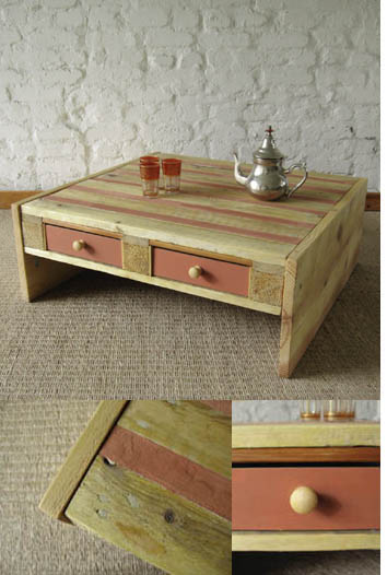 Αυτό το σύγχρονο και μοντέρνο τραπεζάκι , με ρίγες στο χρώμα της ώχρας, έγινε από μια ξύλινη παλέτα και δεν μπορείται να το βρείτε σε καταστήματα του εμπορίου.Δεν χρειάστηκε η αφαίρεση καρφιών και ξύλου γιατί χρησιμοποιήθηκε ολόκληρη η παλέτα.Τα κύρια υλικά που θα χρησιμοποιηθούν είναι κονίαμα (άμμο και νερό, ή τσιμέντο) για να καλυφθούν τα κενά και 2 πλάγιες πλάκες για στήριγμα.Αν θέλετε πιο σύγχρονο design, μπορείτε να συμπληρώσετε τις ρωγμές με σκυρόδεμα, και στη συνέχεια να το καλύψετε με κερί. Ας δούμε στη συνέχεια αναλυτικά πως φτιάχθηκε: