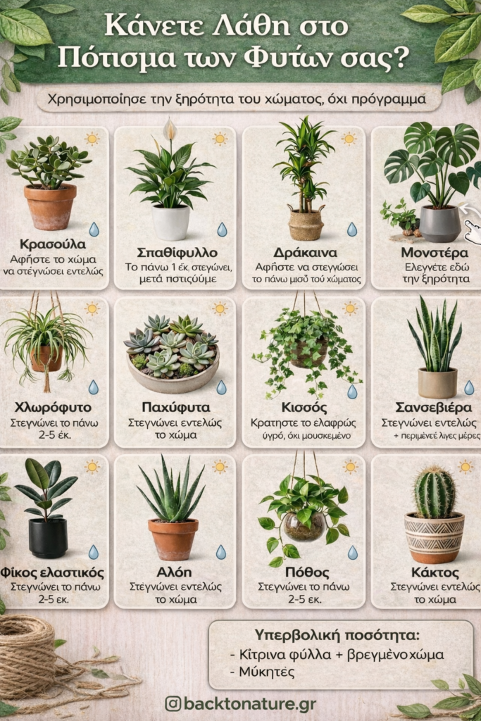 - Εσωτερικός χώρος: Η θέρμανση και η χαμηλή υγρασία ξηραίνουν γρήγορα το χώμα.
